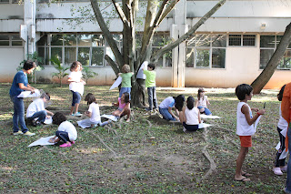 Com esse exercício os alunos tiveram a oportunidade de perceber, através da experimentação, as diferentes texturas nos elementos da natureza (troncos de árvores, pedras, raízes, folhas, etc.)